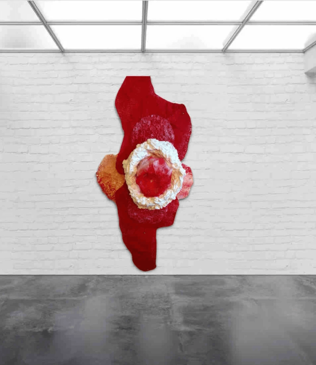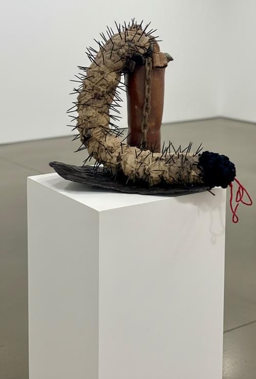 Mixed-media work combining fiber and ceramic that evokes a body in transition, fragile, persistent, and newly exposed. Soft, stitched forms press against hard, fired surfaces, suggesting emergence, survival, and uneasy moment between containment and freedom.