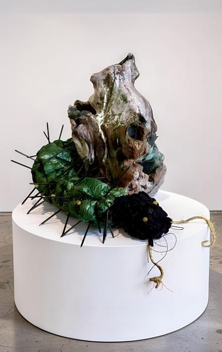 The hard, eroded ceramic core anchors the piece, while the stitched, beaded, and spiked textile elements extend it into something tactile and alive. This unusual combination collapses boundaries between craft and sculpture, creating a form that is at once ornamental, and quietly confrontational.